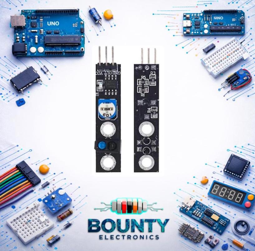وحدة TCRT5000 KY-033 هي حساس بصري بالأشعة تحت الحمراء يستخدم بشكل أساسي في روبوتات تتبع الخطوط، حيث يرسل ضوء IR ويكشف عن انعكاسه لتحديد ما إذا كان السطح عاكسًا (مثل الأبيض) أم ماصًا (مثل الأسود). تتميز بوجود باعث ضوء (LED) ومستقبل ضوء (phototransistor) ومقاومة متغيرة لضبط الحساسية، وتعمل بجهد 3.3-5V، وتوفر خرج رقمي (TTL) وخرج تناظري، وتتصل بسهولة مع متحكمات مثل الأردوينو للكشف عن الأسطح أو العوائق