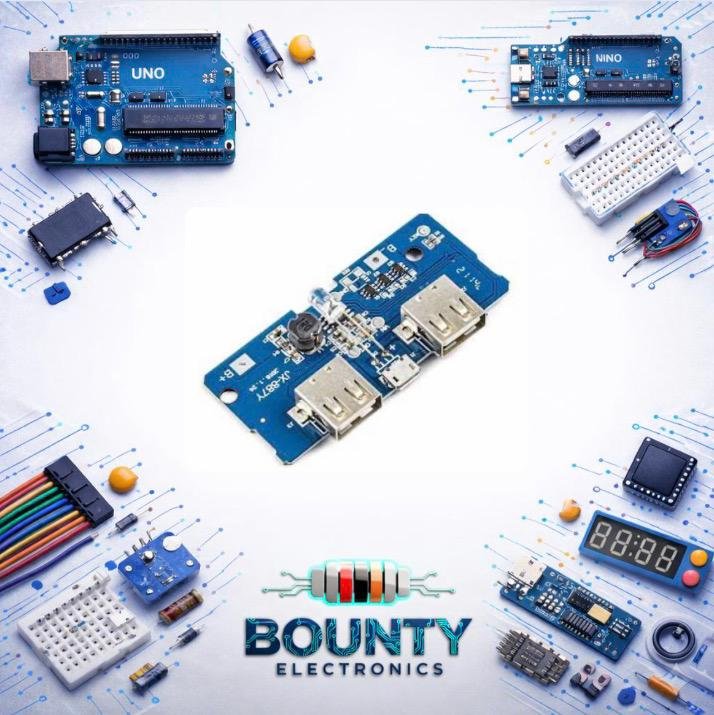 تُستخدم وحدة بنك الطاقة (Power Bank Module) ذات المنفذين وشاشة العرض في مشاريع DIY (اصنعها بنفسك) لبناء شواحن محمولة باستخدام بطاريات الليثيوم (مثل 18650). تتيح لك هذه الوحدة تحويل جهد البطارية إلى 5 فولت ثابت لشحن الهواتف والأجهزة الأخرى