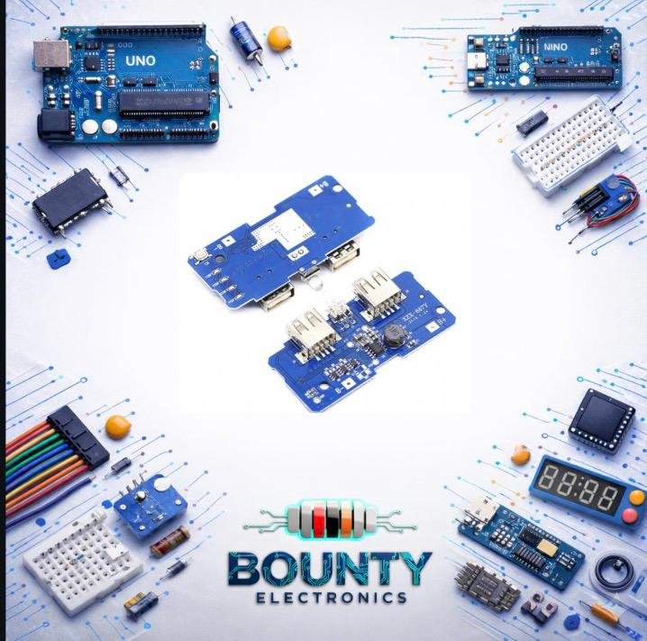 وحدة باور بانك (Power Bank Module) بقدرة 5 فولت 2 أمبير (5V 2A) هي لوحة دوائر إلكترونية (PCB) مصممة لمشاريع الـ DIY، تحتوي على منفذين USB للإخراج، وتعمل لبطاريات الليثيوم (مثل 18650). تتميز بوجود مؤشر LED ذكي لعرض نسبة الشحن، وتدعم حماية البطارية من الشحن الزائد والتفريغ