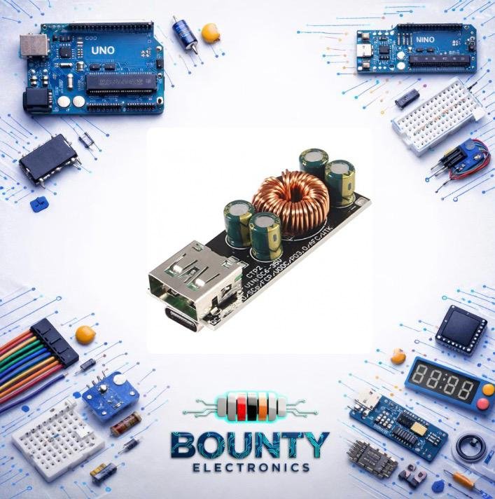 وحدة شحن سريع (Buck Module) مصممة لتحويل جهد التيار المستمر العالي (مثل بطارية سيارة أو مصدر طاقة 12V/24V) إلى جهد منخفض متوافق مع الأجهزة الذكية التي تدعم تقنية Quick Charge 4.0 (QC4).