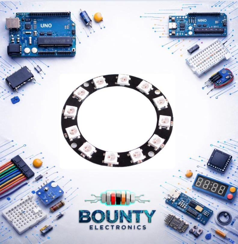 وحدة W2812B ذات الـ 12 حلقة هي عبارة عن دائرة متكاملة مدمجة (IC) في مصابيح LED فردية RGB، تسمح بالتحكم في كل مصباح (بكسل) بشكل مستقل عبر سلك بيانات واحد (DIN) بالإضافة إلى الطاقة (VCC) والأرضي (GND)، مما يوفر ملايين الألوان ويمكن استخدامه في شرائط أو حلقات، وتُعد شائعة في مشاريع الإلكترونيات مثل الأردوينو بسبب دعمها الواسع، ولكنها قد تكون أقل استقراراً من شرائح أحدث مثل WS2813 أو SK6812، وفقاً للمصادر