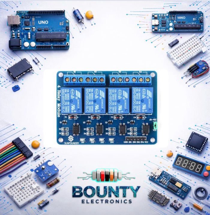 - طريقة الربط: تحتوي على 4 مداخل (IN1, IN2, IN3, IN4)، كل مدخل يتحكم في مرحل (Relay) منفصل